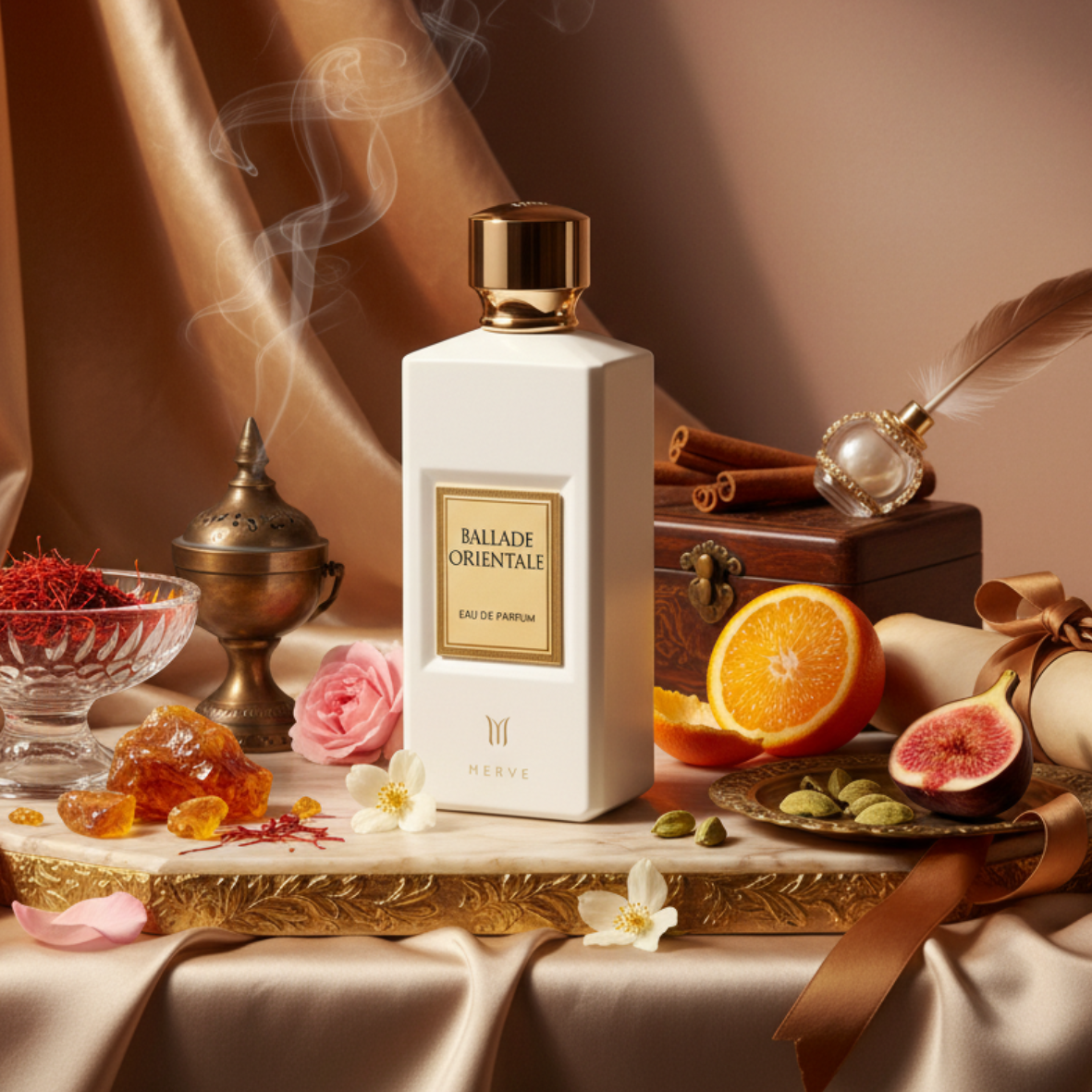 Merve Ballade Orientale is a journey into an orchard bathed in sunlight. Peach and apricot mingle with warm amber and soft sandalwood, creating an exotic, refined fragrance that captures the mystique of the Orient.